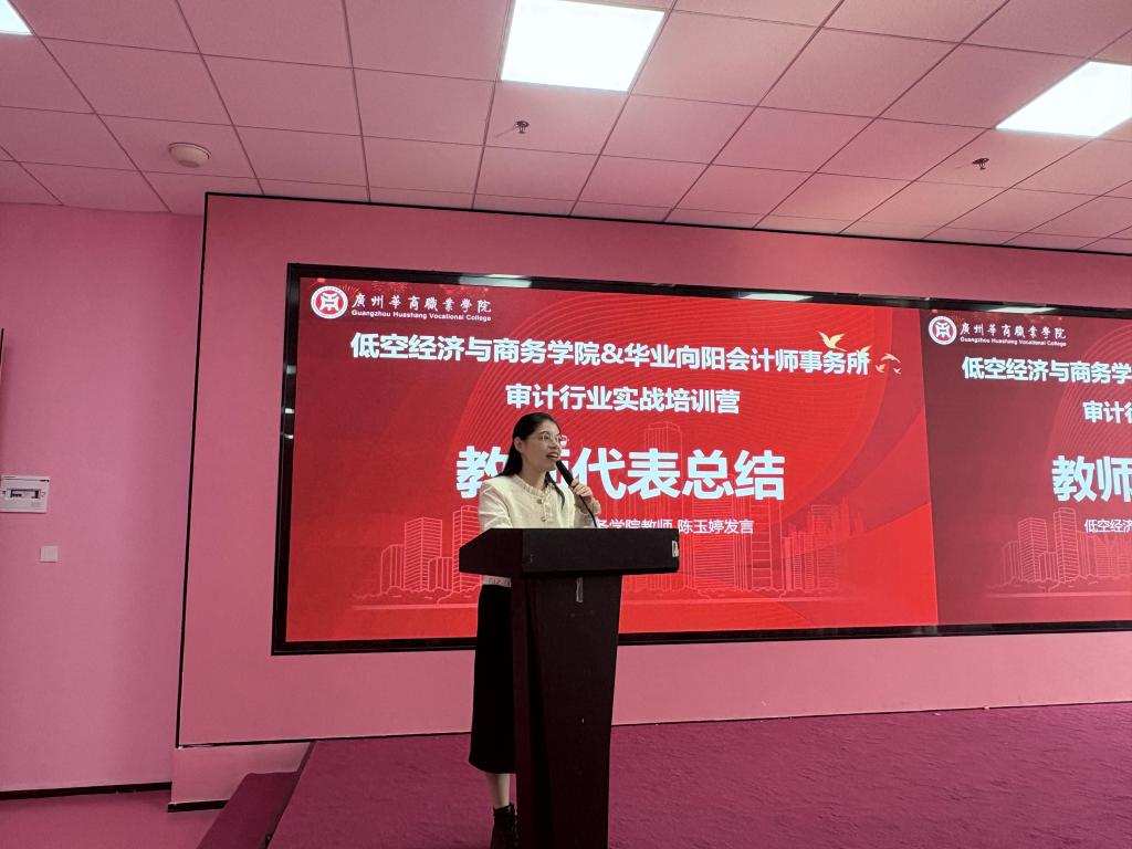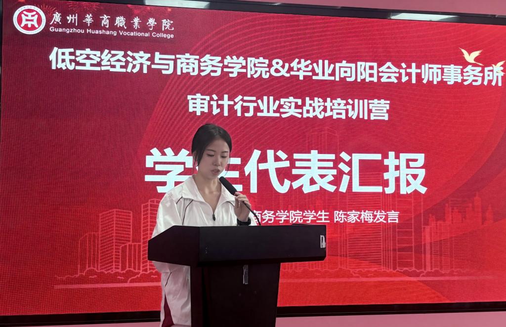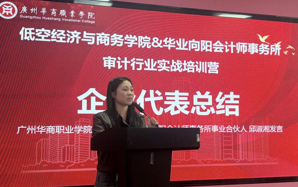 在备受关注的企业代表发言环节,华业向阳会计师事务所事业合伙人、同时也是广州华商职业学院优秀校友的邱淑湘女士,以“学姐”与“行业导师”的双重身份,对本次培训成效给予高度评价。她结合自身职业成长经历,向学弟学妹们提出了真挚建议:坚守职业道德、保持持续学习、勇于面对挑战,并鼓励大家以“无畏心态”迎接职场,在审计这条道路上脚踏实地、行稳致远。其深情而充满力量的分享,引起了在场师生的强烈共鸣。