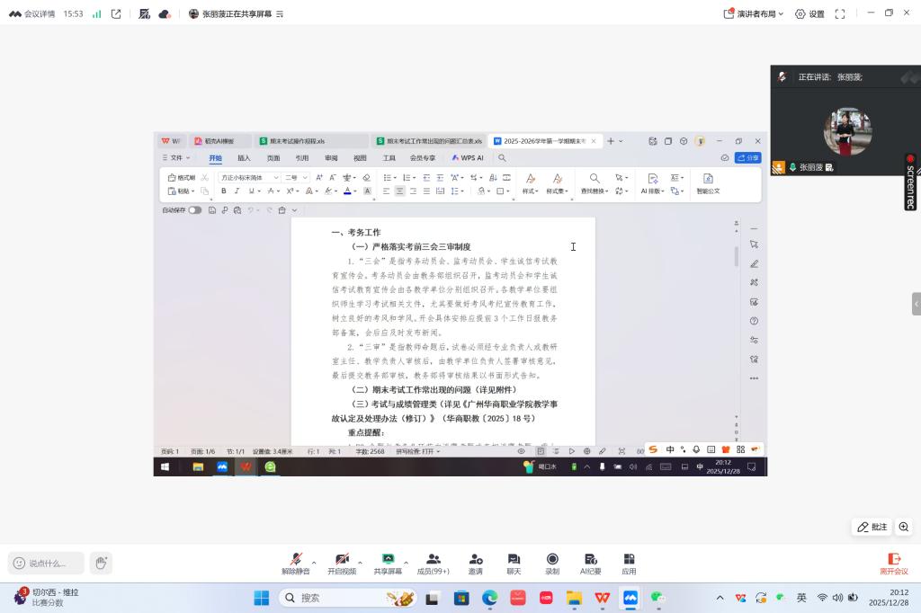 为确保期末考务工作规范有序,严肃考风考纪,强化监考责任意识,低空经济与商务学院于2025年12月28日晚8点,通过腾讯会议线上召开了2025年秋季学期期末监考动员大会。会议由学院副院长张丽菠副教授主持,全体教职工参加会议。