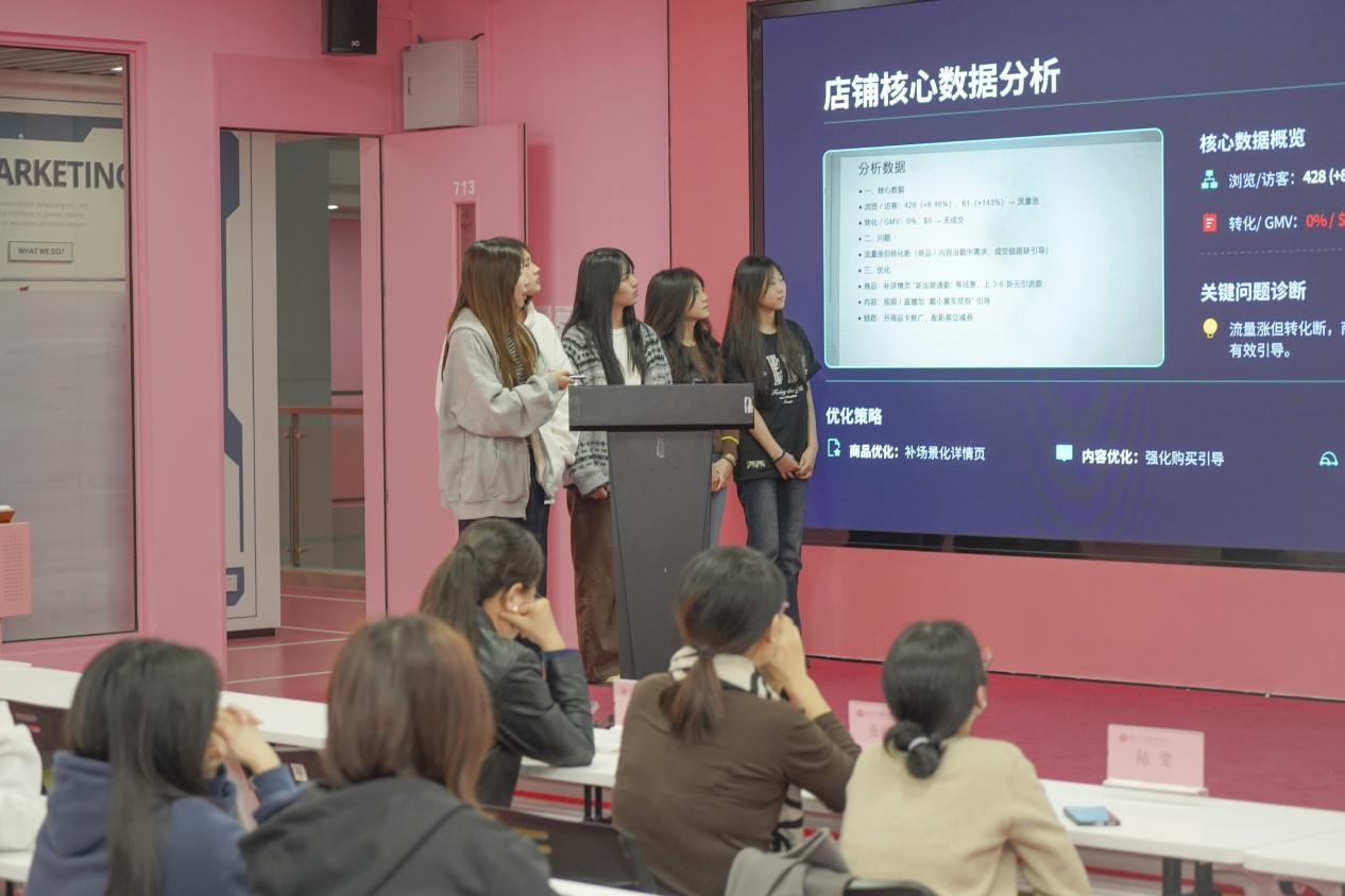 随后,优秀小组代表上台进行项目成果展示,展示了在本项目中取得的TikTok店铺运营成果和TikTok直播运营成果,并分享了在完成项目任务的过程中收获的跨境电商运营实战经验、职业素养以及团队合作的心得体会。