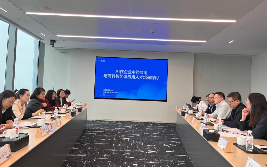 2026年1月21日,广州华商职业学院低空经济与商务学院院长杨玲、副院长潘虹及教研室主任刁慧娜、魏芳芳、赵敏、张德荣、胡婷以及骨干教师等一行赴金蝶软件(中国)有限公司开展产业调研交流。金蝶软件(中国)有限公司战略联盟及教育事业部副总经理陈跃、华南区总监魏佳丹、解决方案总监罗万准、广州品牌与市场部政府生态经理叶根、校企合作经理何锦漫出席会议。