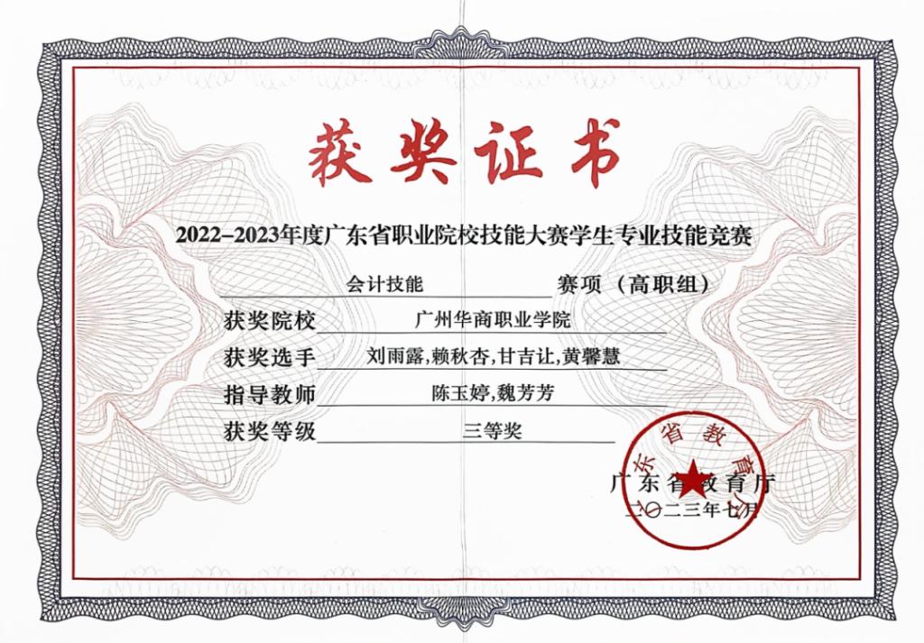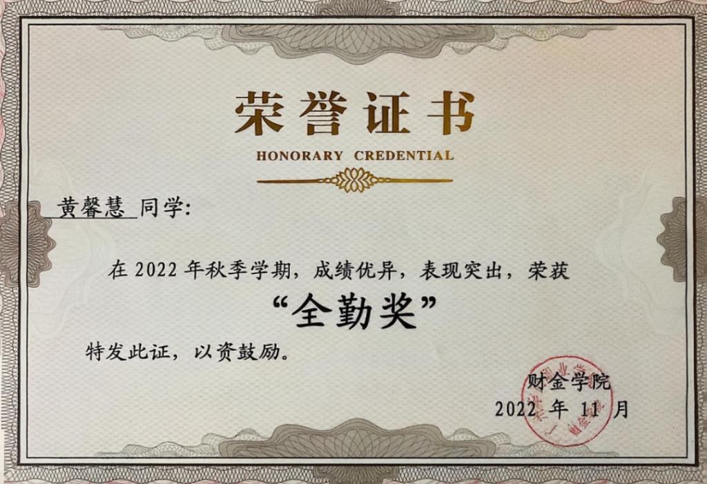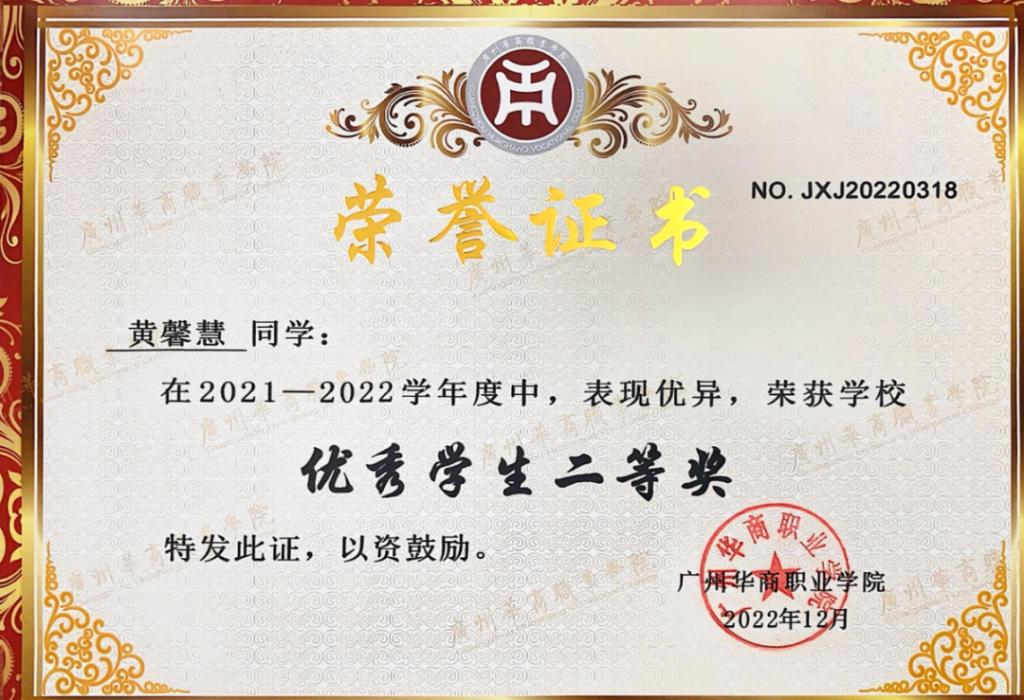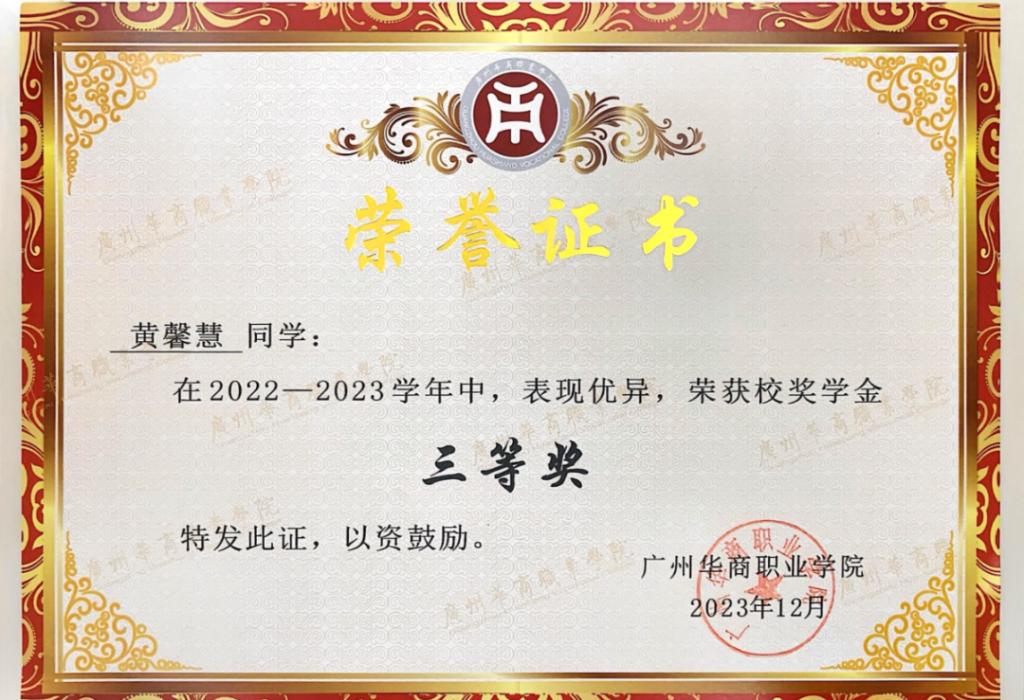 这份勇于挑战、勤于耕耘的精神,让黄馨慧收获了诸多沉甸甸的荣誉。在专业领域,她凭借扎实稳固的会计功底与出色娴熟的实操能力,代表广州华商职业学院征战广东省学生专业技能竞赛,在众多参赛选手的激烈角逐中脱颖而出,最终斩获三等奖的优异成绩,为校争光;在校园学习生活中,她连续斩获学校优秀学生二等奖、三等奖学金,拿下学院全勤奖、学习标兵等多项荣誉称号,用实打实的成绩印证了“一分耕耘,一分收获”的真理;在思想引领类活动中,她与团队成员凝心聚力、反复打磨作品,在“华商情·强国梦·喜迎二十大”活动评比中崭露头角,成功荣获“特等奖”,充分展现了华商新时代青年学子深厚的家国情怀与强烈的责任担当。