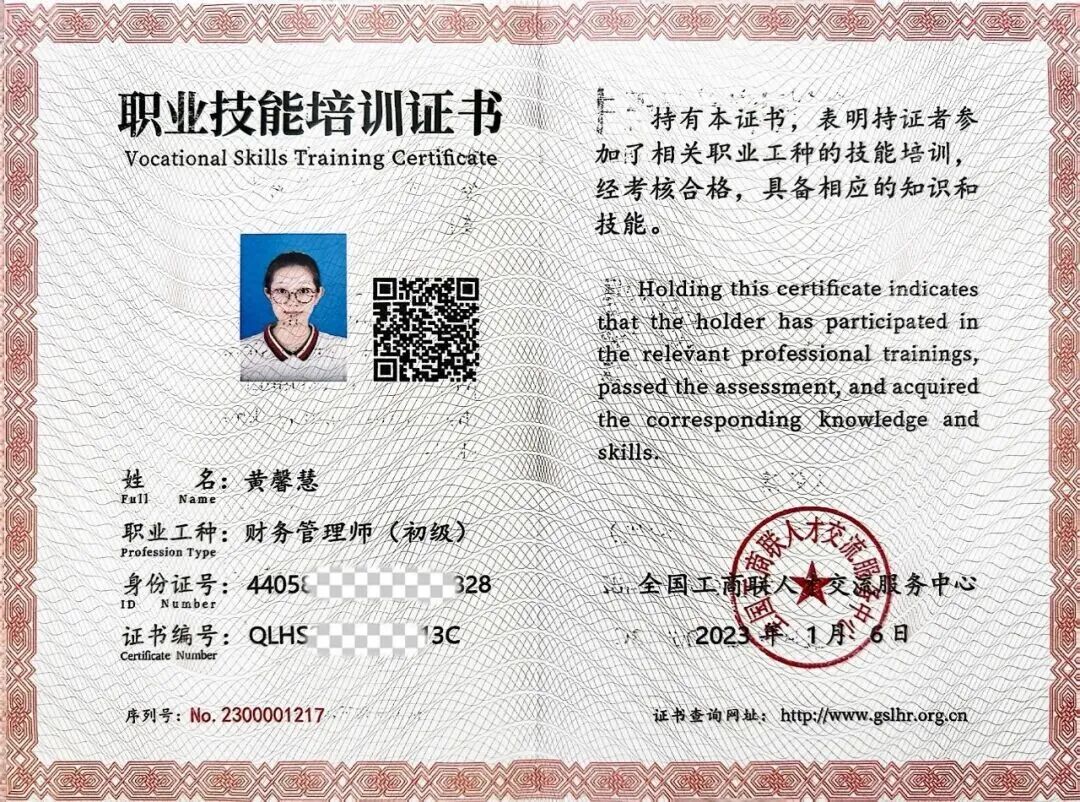 除了竞赛与学业上的亮眼成就,黄馨慧还积极考取各类资格证书,为自己的未来发展增添硬核筹码。在校期间,她凭借不懈努力顺利通过高等学校英语应用能力考试A、B级,成功拿下全国高等学校计算机水平考试一级证书,先后考取职业技能培训证书——财务管理师(初级)、工业和信息化人才专业知识测评证书——会计电算化科目,更以459分的优异成绩顺利通过全国大学英语四级考试。一张张含金量十足的证书背后,是她利用课余时间的刻苦钻研,是她对自我要求的不断提升,更是她为未来职业发展与学业进阶铺设的坚实道路。