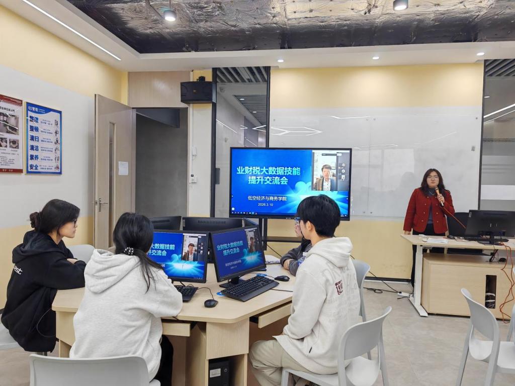 为深化产教融合,推动专业教学与行业实务精准对接,提升师生业财税大数据应用能力,2026年3月10日,低空经济与商务学院业财税大数据技能提升交流会在创科208顺利举行。本次交流会由大数据与会计教研室主任刁慧娜老师主持,特邀网中网王哲经理线上开展专题分享,学院多名骨干教师及优秀学生代表到场参与研讨。