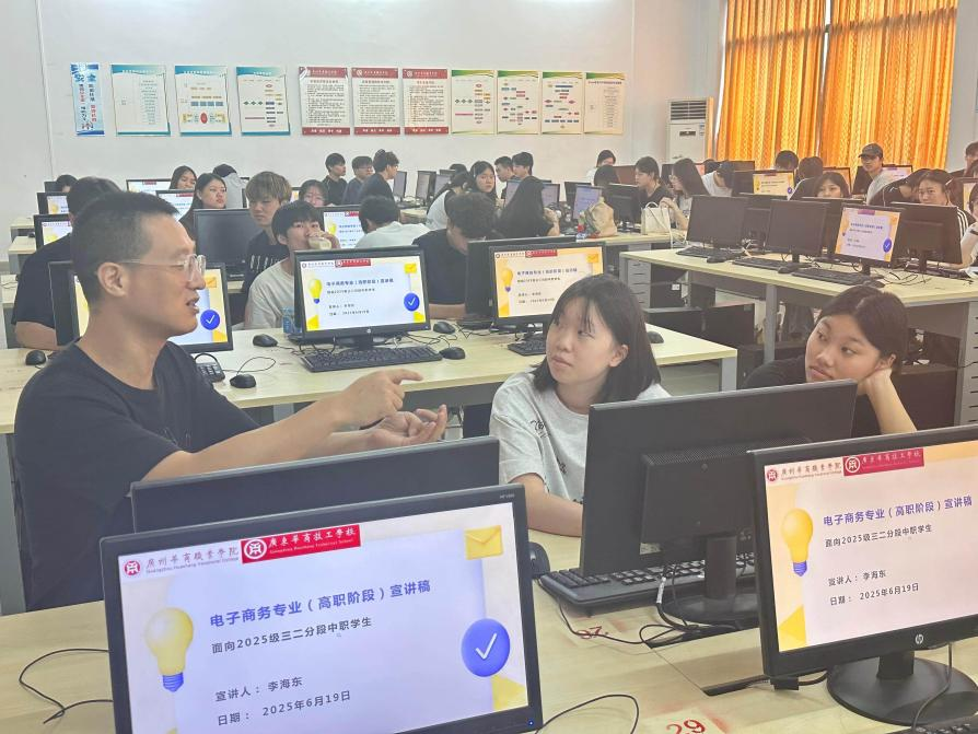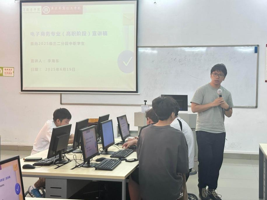 2025年6月19日 上午,数字商务学院面向2025级三二分段中职学生召开电子商务专业高职阶段宣讲会。活动由广东华商技工学校王秀丽主任主持开场,电子商务专业李海东教授主讲,辅导员张磊现场讲解管理服务体系,近百名中职学子到场聆听,现场反响热烈。