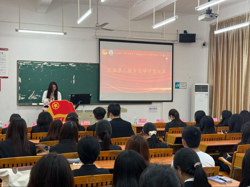 总监票人周冰娜老师现场向全体代表报告选举计票结果,主持人正式宣布共青团广州华商职业学院低空经济与商务学院第一届委员会委员名单,标志着学院共青团新一届领导集体正式诞生。