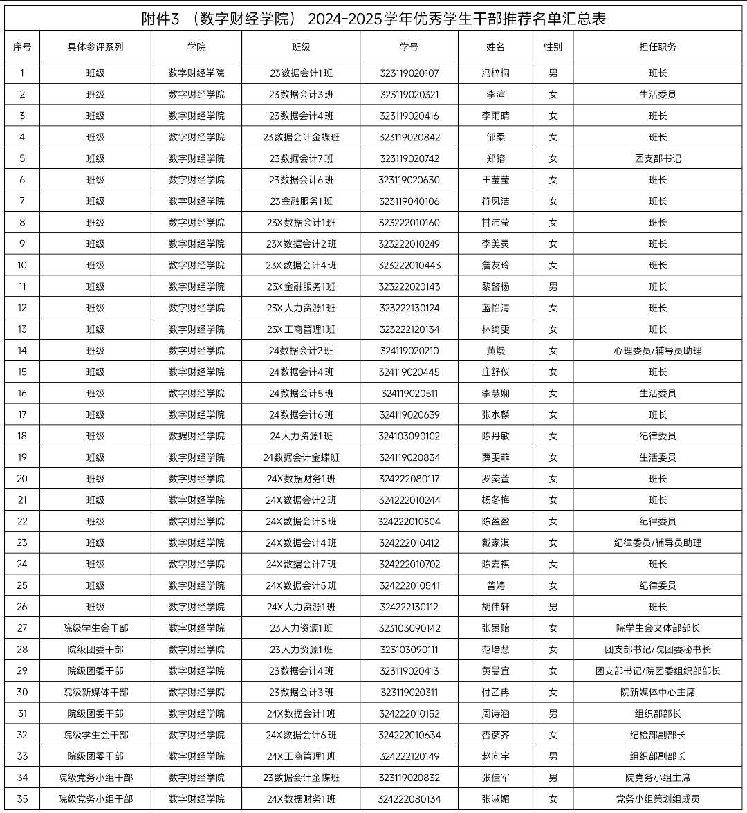 为肯定学生干部的学习和工作成绩、表彰先进、树立典型,激励广大学生干部勤奋学习、关心集体、锻炼工作能力、提高综合素质,更好地为学校的建设和发展服务,根据华职学 〔2025〕30号 《关于2024-2025学年优秀学生干部评选的通知》文件内容,我院本着“公开、公正、公平、择优”的原则,经学生自主申请,辅导员评议和学院评审小组审核,我院决定拟推荐冯梓桐等35名学生为2024-2025学年校级优秀学生干部,具体公示名单如下: