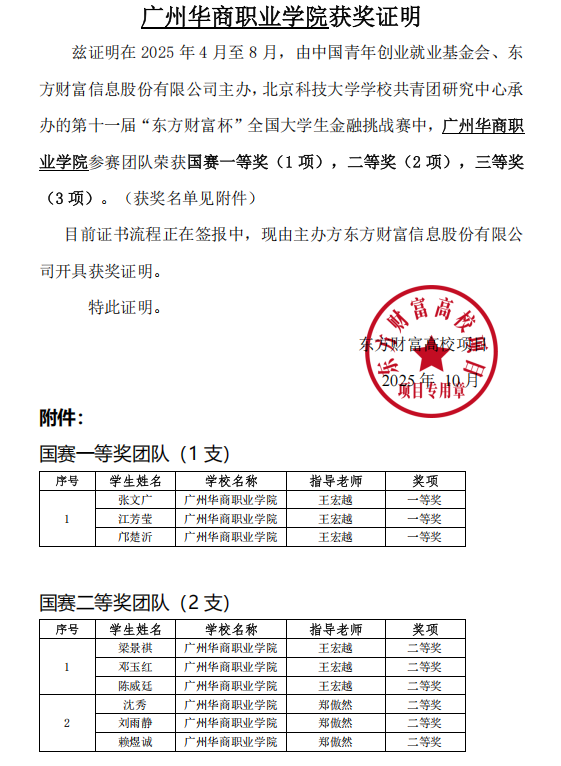 近日,从第十一届“东方财富杯”全国大学生金融挑战赛组委会传来捷报,广州华商职业学院参赛团队在比赛中表现卓越,勇创佳绩,共斩获国赛一等奖1项、二等奖2项、三等奖3项,取得历史性突破! 本届大赛由中国青年创业就业基金会与东方财富信息股份有限公司联合主办,北京科技大学学校共青团研究中心承办,是一项面向全国大学生的权威金融赛事,旨在培养大学生的金融实践能力和创新创业精神。比赛历时数月,吸引了全国众多高校的精英学子同台竞技,竞争异常激烈。在本次大赛中,我校学子凭借扎实的专业知识、敏锐的市场洞察力和出色的团队协作能力,从众多参赛队伍中脱颖而出。最终,一支团队荣获国赛一等奖,两支团队荣获国赛二等奖,三支团队荣获国赛三等奖。这一优异成绩充分展现了我校在金融财经类专业人才培养方面的雄厚实力和高水平的教育教学质量。 目前,所有获奖证书正在按流程签报中,获奖证明已由主办方东方财富信息股份有限公司正式开具(获奖名单见附件)。 此次大赛取得的优异成绩,是我校持续推进“以赛促教、以赛促学”教学改革成果的集中体现。它不仅为学校赢得了荣誉,也极大地激发了全校学生钻研专业技能、投身实践创新的热情。学校将继续致力于为学生提供更广阔的学习和实践平台,培养更多高素质技术技能人才,再创辉煌! ] 图文:周贤娴 初审:郭 建 复审:潘紫轩 终审:杨 玲