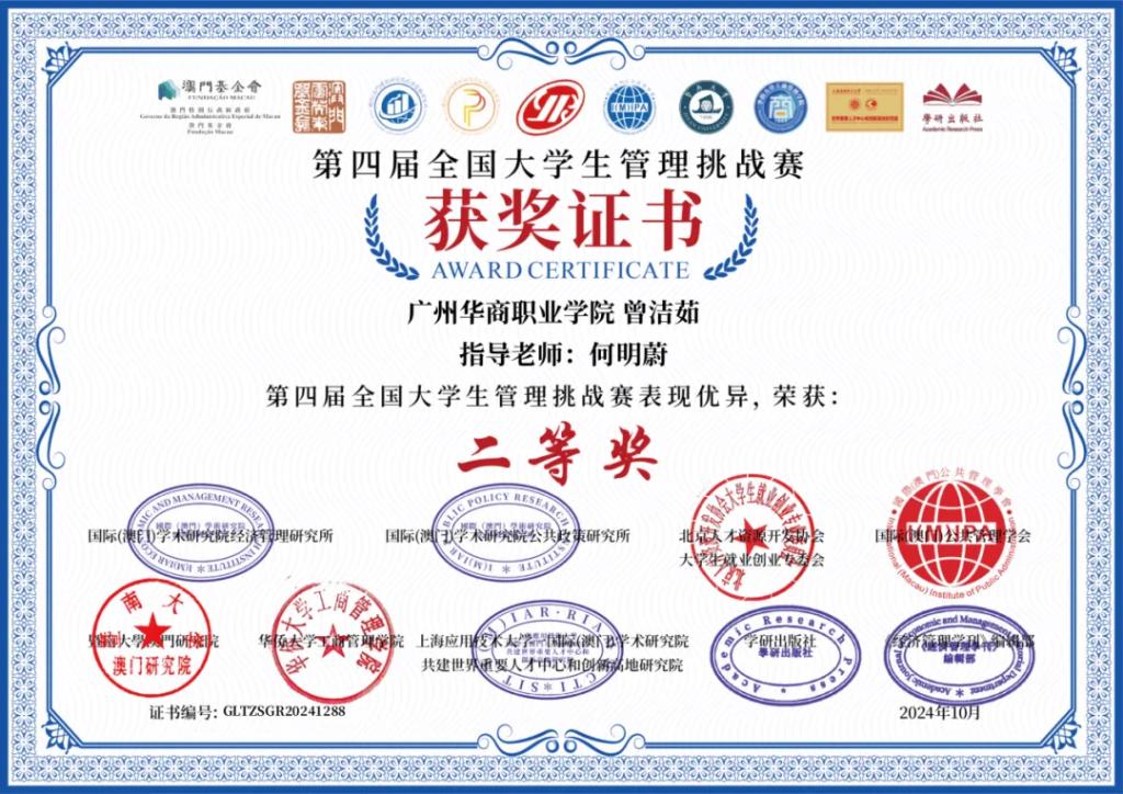 陈小晔,2021级人力资源管理专业学生,升学学校:广东外语外贸大学南国商学院。代表学校参加广东省大学生跆拳道锦标赛,荣获个人冠、亚、季军,蝉联冠军并获得团队总分一等奖。在2023年广东省人力资源管理技能大赛中荣获省级二等奖,带领团队获得首届"华商杯"创新创业大赛一等奖,展现了卓越的综合素质。